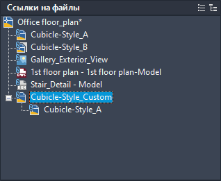 На верхнем уровне дерева всегда показывается текущий чертеж. Файлы ссылок отображаются на следующем уровне. Имеется возможность открывать файлы ссылок, содержащие собственные вложенные ссылки на файлы, и показывать более глубокие уровни. При режиме отображения в виде дерева одновременно можно выбрать только одну ссылку на файл.