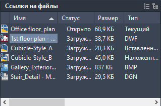В столбце имени первой записью всегда является имя текущего чертежа, за которым следуют имена дополнительных вставленных файлов, выстроенные в порядке их вставки.
