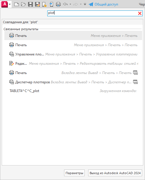 Поле "Поиск команд" отображается в верхней части меню приложения. Результаты поиска могут включать команды меню, основные подсказки и текстовые строки запросов командной строки. Искомые термины можно вводить на любом языке. Результаты применяются к текущему рабочему пространству.