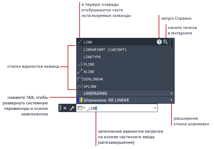 Список предлагаемых вариантов команд отображается при вводе первых букв команды в окне команд или в поле динамического ввода. По умолчанию список имеет следующие характеристики.
