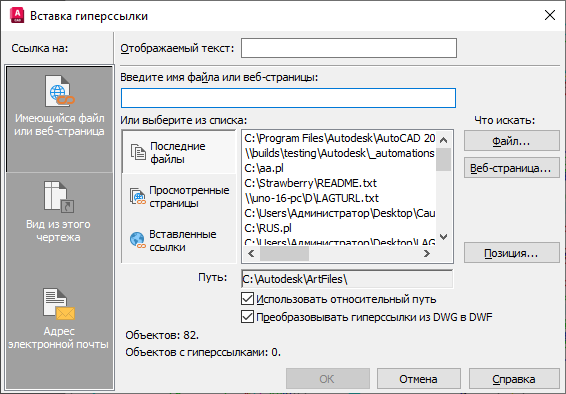 Выбор между использованием относительного и полного пути для гиперссылок. При выборе этого параметра в гиперссылке не сохраняется полный путь к связанному с ней файлу. Для относительного пути устанавливается значение, указанное в системной переменной HYPERLINKBASE, или, если этой переменной не присвоено никакого значения, относительный путь определяется как путь к текущему чертежу. Если этот параметр не выбран, в гиперссылке сохраняется полный путь к связанному с ней файлу.