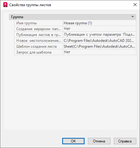 Задание файла шаблона чертежей (DWT) и имени листа в нем, на основе которого создаются новые файлы чертежей для данной группы.