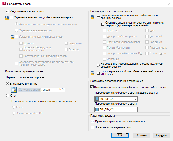 Управляет выводом уведомлений для новых слоев, поведением слоев при изоляции некоторых слоев, применением фильтров слоев к панели инструментов "Слои" и переопределениями фонового цвета видового экрана в Диспетчере свойств слоев.