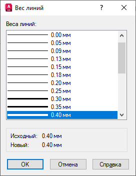 Отображает список имеющихся весов линий, которые могут быть применены для слоя. Здесь перечислены фиксированные значения весов линий, наиболее часто используемые в чертежах. Выбрать нужный вес линий для применения.