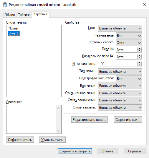 Стили печати отображаются каждый в отдельном столбце, слева направо. Как правило, если количество стилей печати невелико, удобнее пользоваться вкладкой "Таблица". При большом количестве стилей предпочтительнее работать на вкладке "Карточка". На ней все имеющиеся стили перечислены в списке в левой части, а правая часть занята описанием свойств одного выбранного стиля. Стиль NORMAL расположен в начале таблицы именованных стилей печати и является свойством по умолчанию для объектов (стиль печати не назначен). Стиль NORMAL нельзя изменить или удалить.