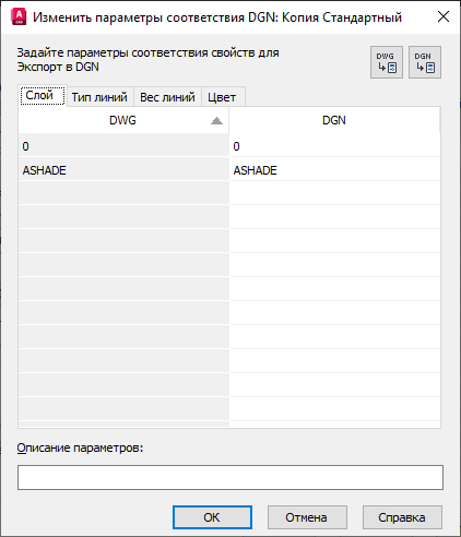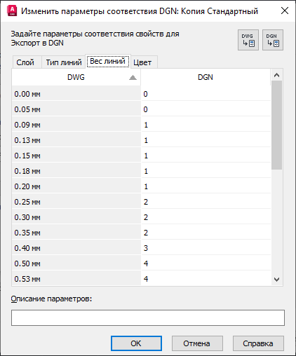 Параметры соответствия для экспорта: Если диалоговое окно "Изменить параметры соответствия DGN" вызвано путем создания нового набора параметров соответствия в диалоговом окне "Параметры экспорта в DGN", в столбце "DWG" содержатся все типы линий, определенные в текущем чертеже. Если ячейка назначения пустая (правый столбец), используется заданное по умолчанию значение соответствия системы.