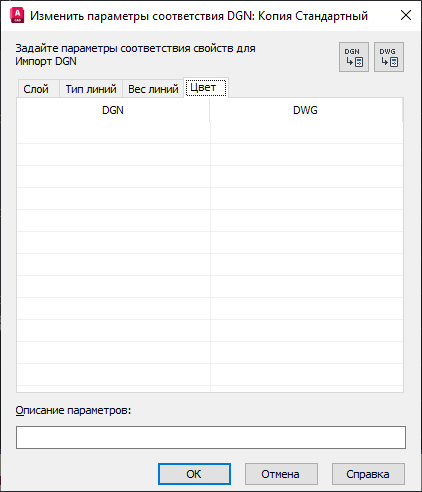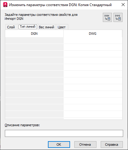 Импорт параметров соответствия: Если диалоговое окно "Изменить параметры соответствия DGN" вызвано при создании нового набора параметров соответствия в диалоговом окне "Параметры импорта DGN", в столбце "DGN" содержатся все типы линий, определенные в импортируемом файле DGN, а также определенные в файле-прототипе DGN на момент создания файла DGN.