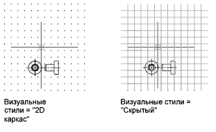 Можно изменить стиль отображения сетки с помощью нескольких параметров на вкладке "Шаг и сетка" диалогового окна "Режимы рисования". Например, сетка по умолчанию отображается в виде прямоугольной комбинации линий, но вместо это можно использовать стиль пунктирной сетки, как в предыдущих версиях, если для визуального стиля установлено значение "2D каркас".