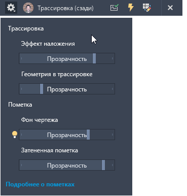 Затененная пометка. Управление степенью прозрачности затененных пометок, когда цифровая пометка активна. Чем меньше число, тем заметнее пометка. Регулятор «Затененная пометка» изменяет системную переменную TRACEMARKUPFADECTL.
