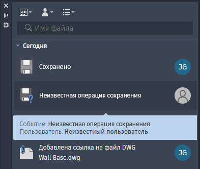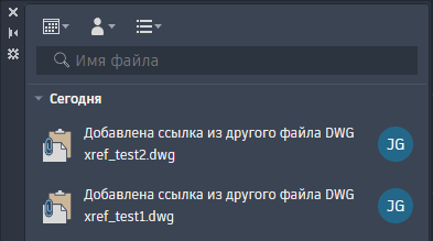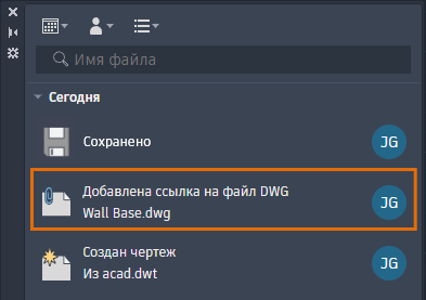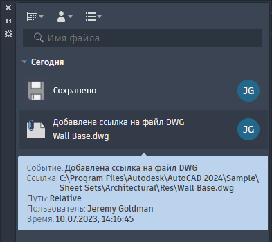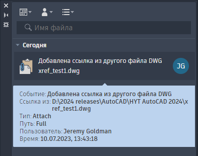 Наведите указатель на событие «Добавлена ссылка из другого файла DWG», чтобы просмотреть сведения о нем.
