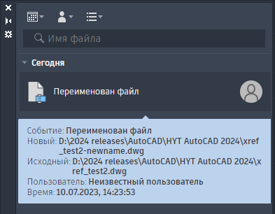 В этом разделе воспользуемся проводником для переименования файла xref_test2.dwg и посмотрим, какой тип события отобразится на палитре «Аналитика действий».