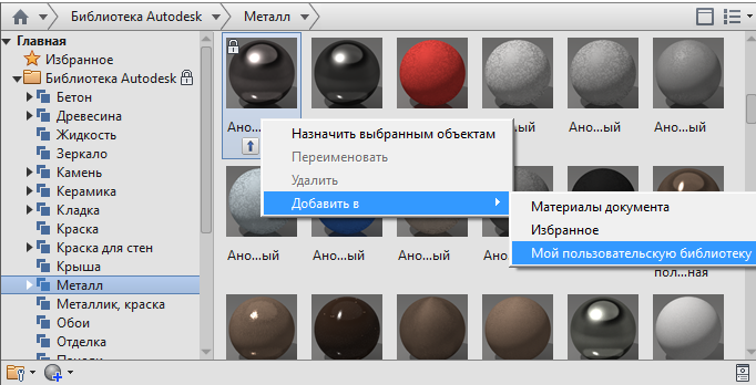 На вкладке "Материалы" щелкните правой кнопкой мыши образец материала, выберите "Добавить" и укажите библиотеку, куда его необходимо добавить. Если пользовательская библиотека не существует, то сначала нужно ее создать.