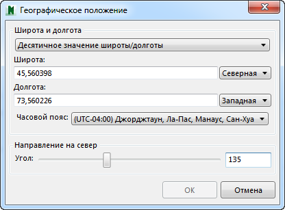 Это диалоговое окно служит для задания широты, долготы и направления на север географического местоположения в модели. На панели "Сцена" показано настроенное положение солнца согласно заданному часовому поясу.