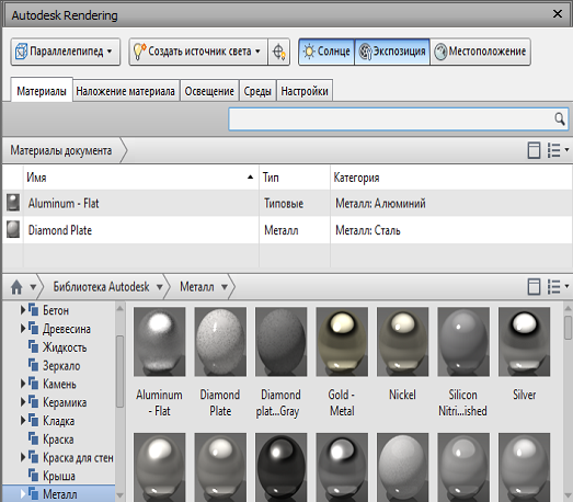 Библиотека Autodesk, содержащая более 700 материалов и 1000 текстур, включена в состав продукта. Можно добавлять в модель материалы Autodesk, редактировать их и сохранять в собственной библиотеке. Окно "Визуализация Autodesk" служит для перемещения и обработки как материалов Autodesk, так и пользовательских материалов.
