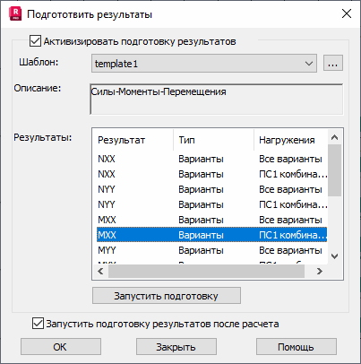 При работе с плитами, оболочками или объемными конструкциями для подготовки результатов, которые будут представлены на карте, выберите команду меню "Расчет" > "Подготовка результатов".