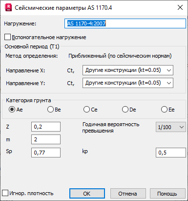 Параметры упрощенного сейсмического расчета по методу эквивалентной боковой силы зависят от сейсмических норм и метода определения значений основных периодов в диалоговом окне Сейсмический расчет.