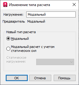 Это диалоговое окно используется для изменения типа анализа на Модальный или Модальный расчет с учетом статических усилий.