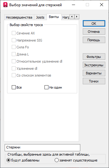 - SIG напряжения - колонка для нормального напряжения в кабеле для монтажного варианта нагружения (с учетом хорды кабеля), получаемого для нагрузок, предусмотренных вариантом монтажного нагружения.