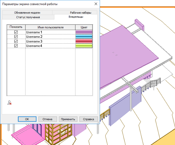 "Параметры экрана совместной работы". В модели отображается указанный цвет для соответствующего владельца.