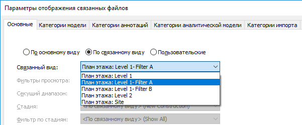 - В диалоговом окне "Параметры отображения связанных файлов" на вкладке "Основные" выполните следующие действия.