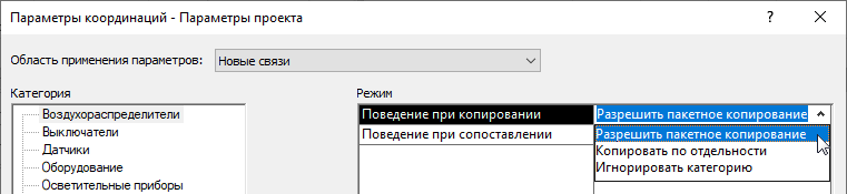 Предположим, что сначала был задан режим «Игнорировать категорию», а затем потребовалось скопировать этот тип приборов в модель MEP. Для этого необходимо определить параметры координации для модели MEP или для конкретной связанной модели. В противном случае приборы из связанных моделей, относящиеся к данной категории, в программе не распознаются.