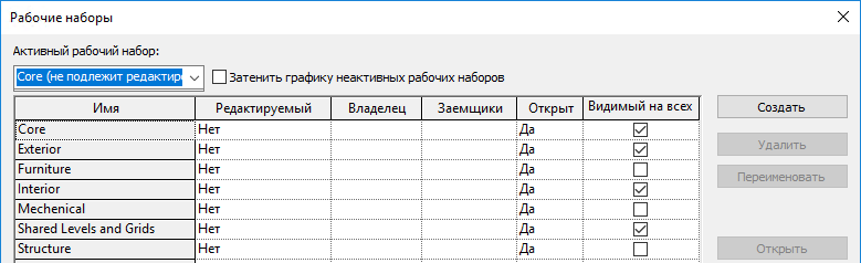 При создании рабочего набора можно в диалоговом окне "Новый рабочий набор" установить или снять флажок "Видимый на всех видах", определяющий режим отображения данного рабочего набора на всех видах модели. Эта настройка отражена в столбце "Видимый на всех видах" диалогового окна "Рабочие наборы".