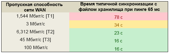 Обратите внимание, что приводимая нами «пропускная способность сети WAN» отражает фактическую пропускную способность сети, а не номинальное значение подключения. Такие внешние факторы, как несвязанный потоковый трафик, могут снизить реальную пропускную способность, поэтому мы рекомендуем проверить поведение сети при типовом использовании. Это можно с легкостью сделать, измерив время, необходимое для копирования нескольких сотен мегабайтов данных из одной точки сети в другую. (Обратите внимание, что необходимо соблюдать осторожность, чтобы сжатие и пакетная передача в сети не повлияли на производительность работы.)