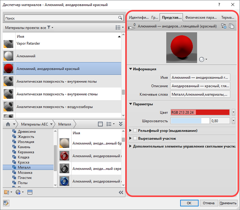 В Обозревателе материалов эти сведения отображаются на вкладках "Идентификация", "Графика" и "Внешний вид" панели "Редактор материалов".