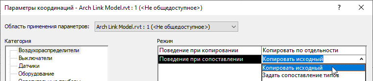 Перед копированием приборов из связанной модели в модель MEP или непосредственно в процессе копирования следует задать в диалоговом окне «Определение параметров координации» режим сопоставления для каждой категории приборов.