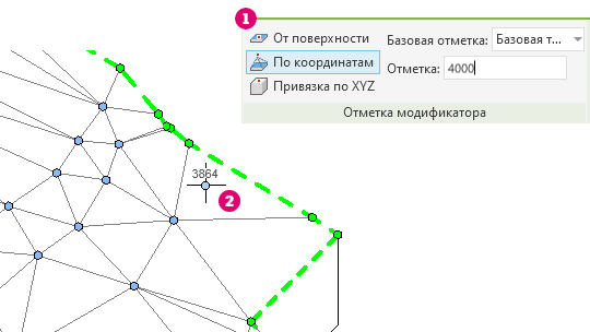 При добавлении точек во время редактирования формы используйте параметр «Базовая отметка», чтобы определить относительную отметку точки. Можно выбрать создание отметок от текущего уровня, базовой точки проекта, точки съемки и внутреннего начала координат. Можно определить, будут ли точки добавлены в абсолютной отметке от выбранной базы отсчета или смещены на заданное расстояние от существующей поверхности.