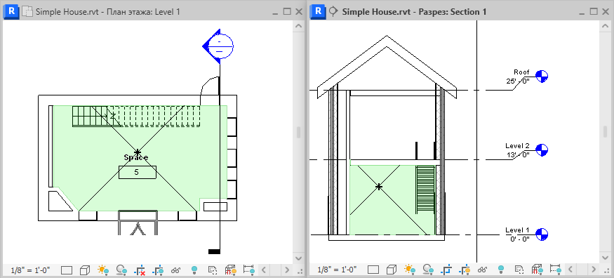 - Закройте все виды, кроме разреза и плана этажа, на котором требуется разместить пространство, и наберите на клавиатуре w t для расположения этих двух видов без перекрывания.