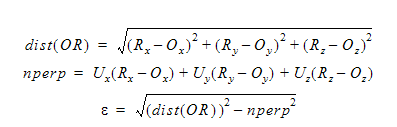 Here, we have subtracted off the non-perpendicular vector to yield the perpendicular distance between the origin of the orbiting system and the axis of the rotating system. The vector (Ux, Uy, Uz) is a unit vector that described the axis of rotation for the orbiting system.