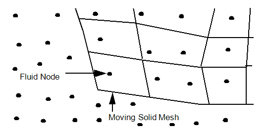 are the global position of the local coordinate system origin.Rather than making a new mesh at each time level, the solid mesh is allowed to pass right through the fluid mesh. When a fluid node is “masked” by a solid element, then the velocity of the closest solid node is applied to this masked fluid node. In our diagram, the fluid node marked with the arrow is being masked by the solid element which is at the corner of the moving part. All the fluid nodes within the boundaries of the moving are considered “masked” and as such have their velocities controlled by the moving solid.