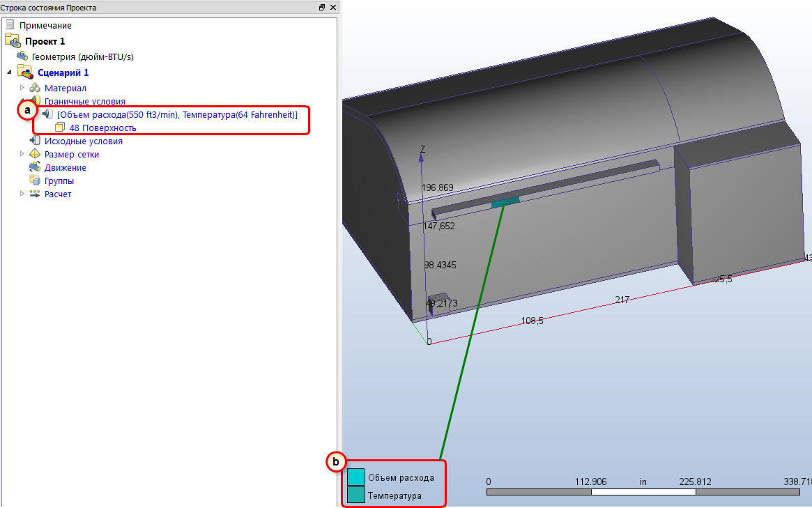 15. Чтобы убедиться в том, что притоку надлежащим образом назначены два граничных условия, проверьте панель «Исследование проекта» и цветные полосы на поверхности подачи: