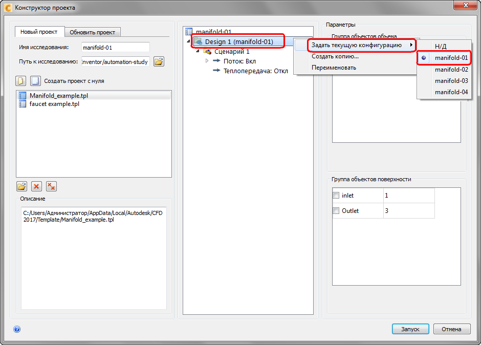 Введите Design 3 для названия проекта, а затем выберите manifold-03 для Конфигурации.