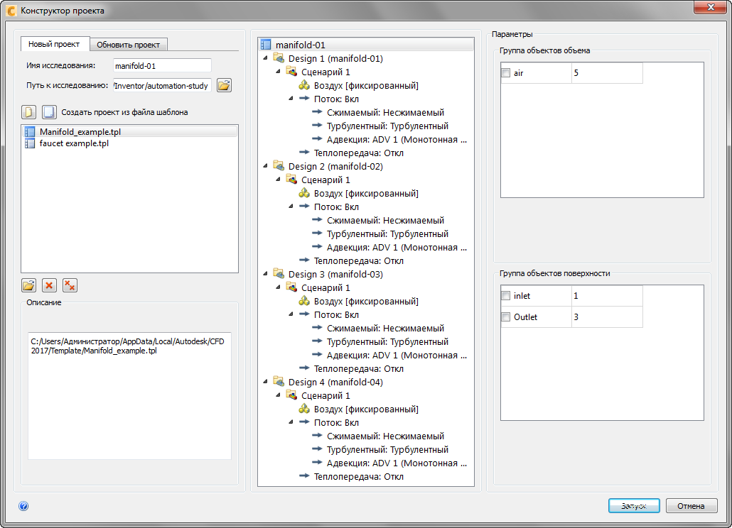 Введите Design 4 для названия проекта, а затем выберите manifold-04 для конфигурации