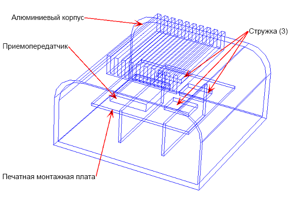 Алюминиевый корпус содержит несколько тепловыделяющих компонентов. Поток вокруг модуля зависит от гравитации и плотности вариаций, вызванных градиентом в температуре воздуха. (Это значение известно также как плавучесть). Ребра на внешней стороне корпуса рассеивают тепло в окружающий воздух.