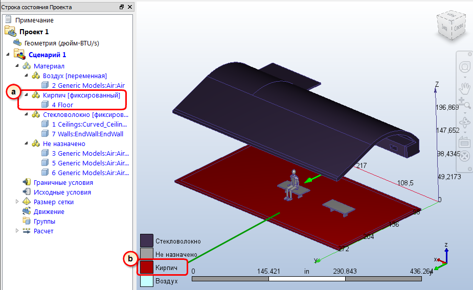 7. Чтобы убедиться, что материал «Кирпич» назначен правильно, проверьте панель «Исследование проекта» и окраску детали: