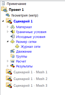 По завершении исследования проекта, Сценарий 1 содержит окончательную сетку. Сценарий 1 — Сетка 1, Сценарий 1 — Сетка 2, и Сценарий 1 — Сетка 3 содержат промежуточные сетки. Строка проекта должна выглядеть следующим образом: