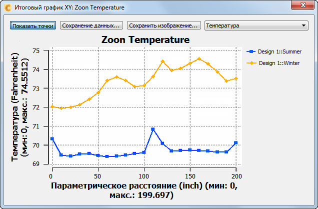 Примечание. Как и ожидалось, более высокая кривая температуры соответствует зимнему сценарию, а более низкая — летнему. В середине летней кривой, мы видим резкий температурный скачок примерно 2° F в 40 дюймов. Это, вероятно, из-за тепла тела пассажира.