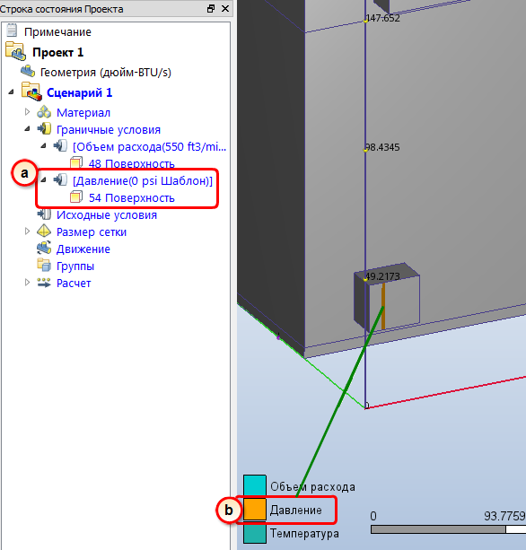 6. Чтобы убедиться, что граничное условие корректно применено к обратному потоку, проверьте панель «Исследование проекта» и цветную полосу на обратной поверхности: