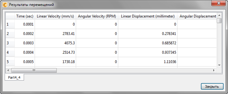 На этом этапе мы используем таблицу Результатов перемещений, чтобы определить динамику смещения и силы на тарельчатом клапане. Эта таблица содержит полную историю скорости, смещения, силы и крутящего момента движущегося твердого тела.