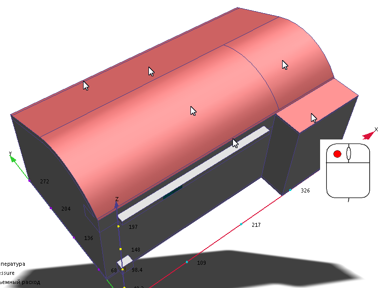5. Поверните модель таким образом, чтобы можно было видеть поверхности на передней стороне зала (противоположной стороне подачи и возврата воздуха).