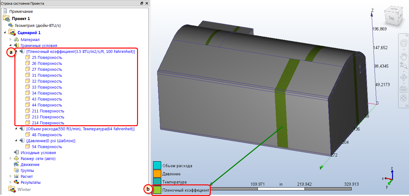 15. Чтобы убедиться в том, что граничное условие коэффициента теплопередачи правильно применено к внешним поверхностям, проверьте панель исследования проекта и цветные полосы на поверхностях: