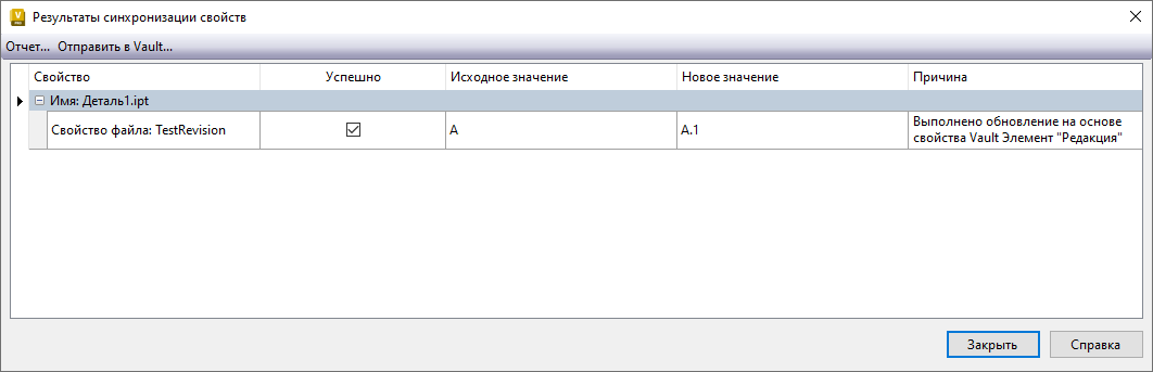 Свойство Inventor (пользовательское свойство) всегда синхронизируется с элементом Part1 (назначенным из первичного состояния модели), поэтому после синхронизации свойство «Редакция_тест» примет значение свойства «Редакция A.1». Однако значение свойства «Редакция» файла останется прежним («A»).