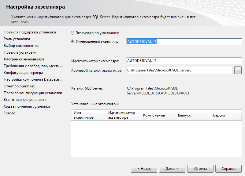 - В окне «Конфигурация экземпляра» выберите именованный экземпляр и введите имя. Можно использовать, например, AutodeskVault или пользовательское имя экземпляра.