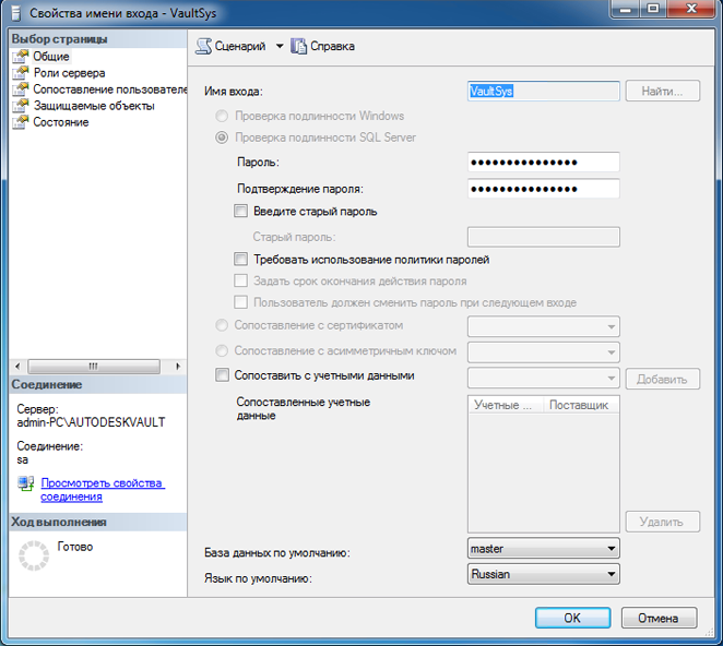 На сервере Microsoft SQL Server создается учетная запись администратора по умолчанию с именем SA. У этой учетной записи имеются все административные полномочия по управлению хранилищами и изменению системных таблиц. При установке сервера SQL Server приложение Vault настроит учетную запись SA с использованием данного пароля по умолчанию. Пока пароль учетной записи системного администратора не изменяется, консоль ADMS не будет требовать вводить его для команд, выполняемых только при указании пароля.