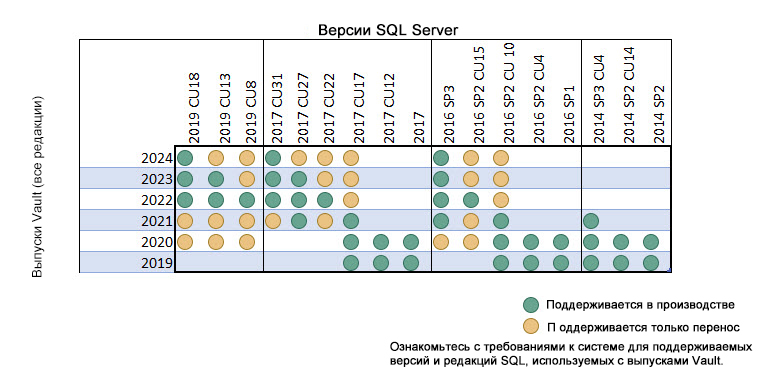 В следующей таблице зелеными точками отмечены совместимые версии Vault и SQL. Желтыми точками обозначены рекомендуемые процедуры обновления. Для проверки совместимости выпусков Vault и SQL см. требования к системе Vault для соответствующей версии.
