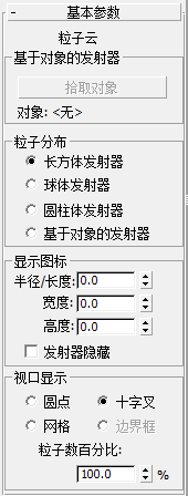 添加粒子云发射器的方式与创建立方体基本体相同:先拖出长度和宽度,然后松开鼠标按钮,通过垂直移动鼠标设置高度,然后单击结束。