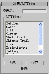使用以下选项可以存储预设值,以便在其他相关的粒子系统中使用。例如,在设置了粒子阵列的参数并使用特定名称保存后,可以选择其他粒子阵列系统,然后将预设值加载到新系统中。